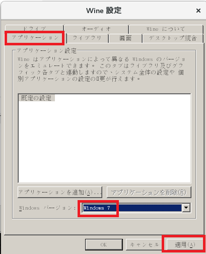 アプリケーションタブで、windowsのバージョンを7にしておく。