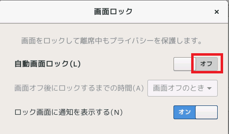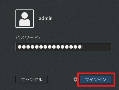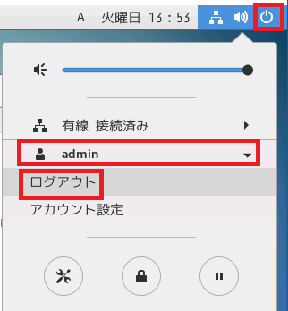画面右上の電源アイコン>ユーザ名>ログアウト